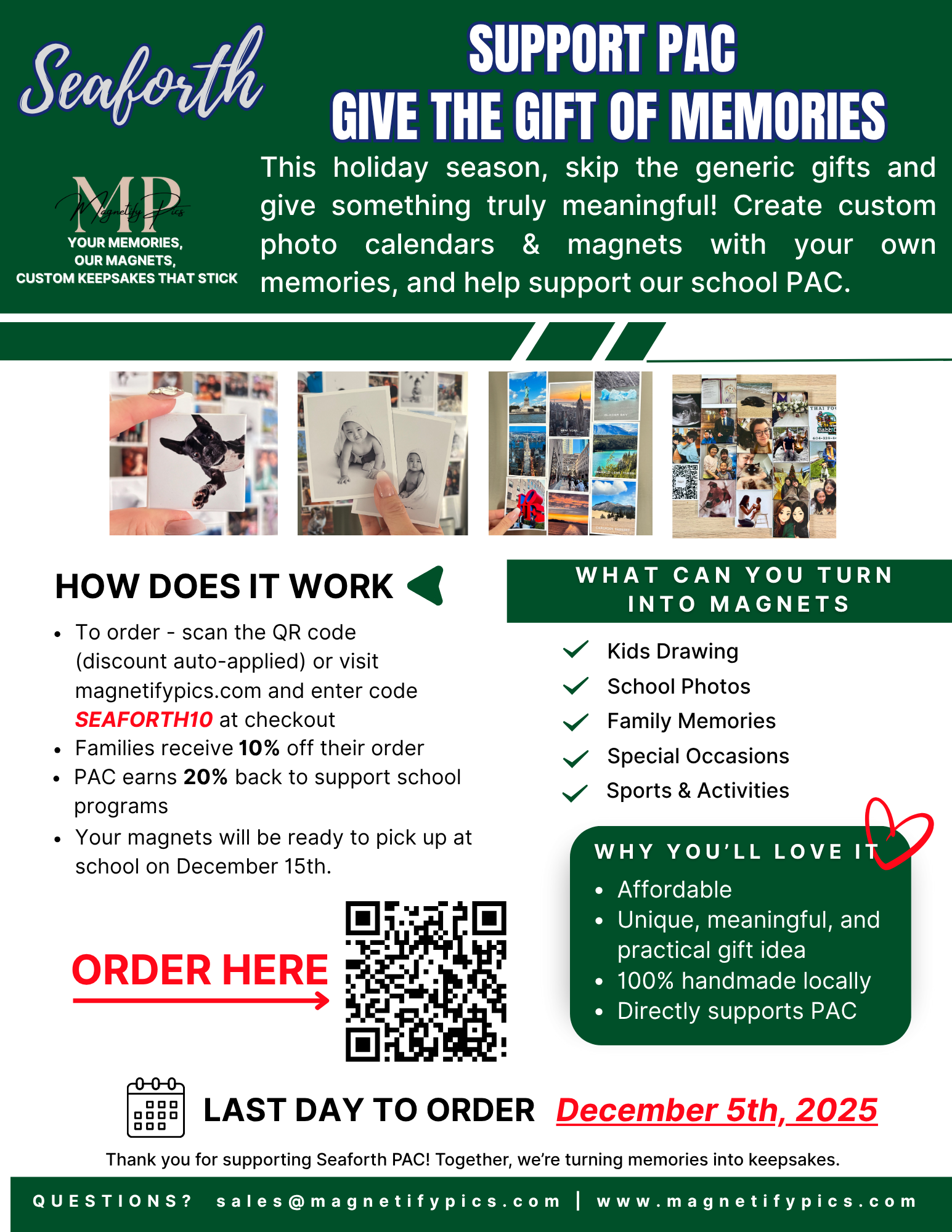 Our MagnetifyPics Fundraiser runs from November 14th to December 5th, offering a fun and creative way to support our school while creating personalized keepsakes for friends and family.